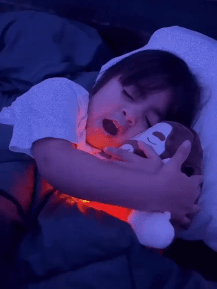 Imagina luces bajas, silencio… y un peluche que acompaña con una respiración suave, una luz cálida y una melodía tranquila.