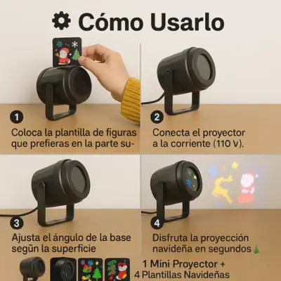 Crea una atmósfera navideña completa en segundos: apaga la luz, enciende el proyector y mira cómo la pared se llena de diseños brillantes y coloridos.